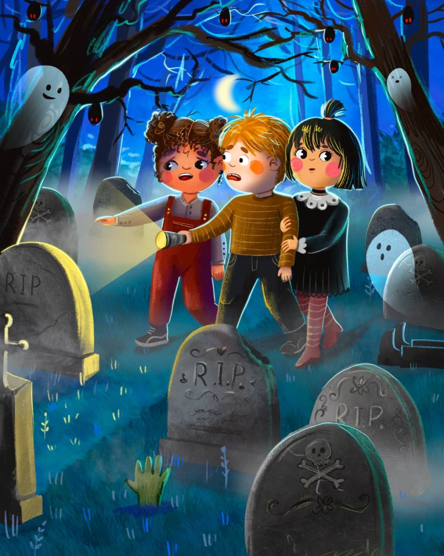 This series of illustrations tells the story of three friends celebrating Halloween together.