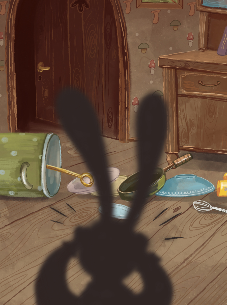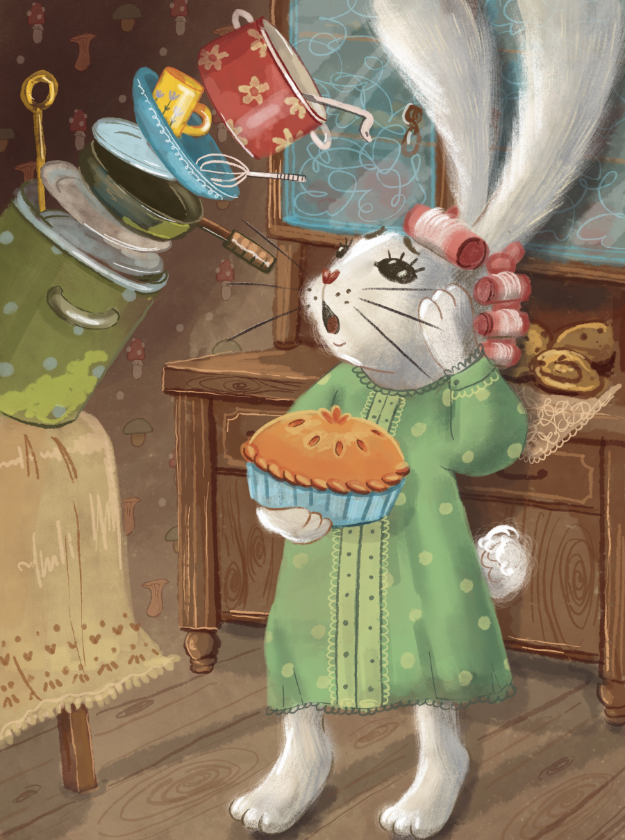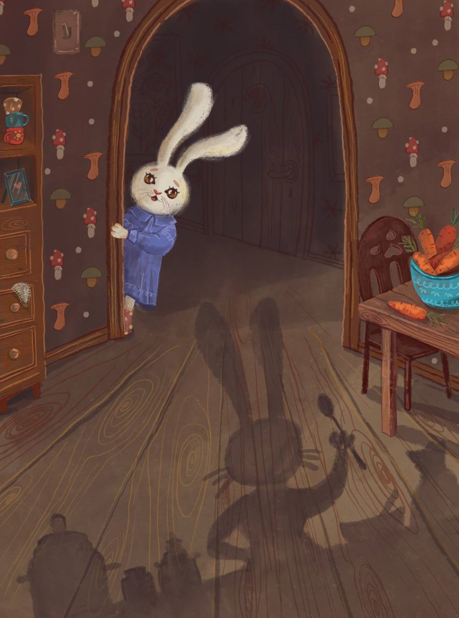 З цікавістю та трохи хвилювання він вирушає дослідити, хто ж порушив нічну тишу. Його шлях проходить вузьким коридором, повз напівпрочинені двері, аж доки він не зазирає на кухню… Там він бачить свою маму-кролицю: вона тихенько бере з підвіконня щойно спечений пиріг і повертається до своєї кімнати.