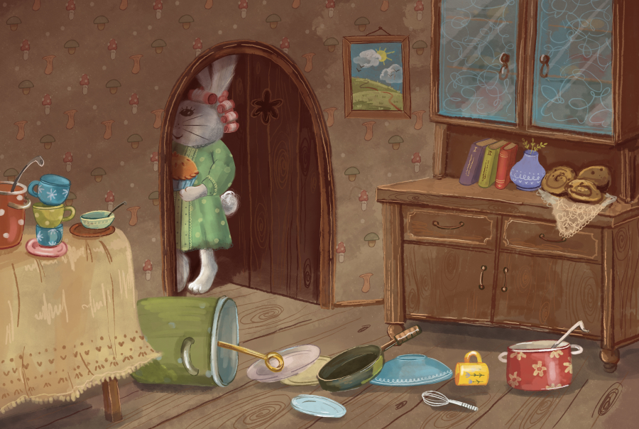Але найбільше здивування чекає на нього тоді, коли погляд падає на купу посуду, що лежить на підлозі. Чи впав він сам? Чи це зробив хтось інший? Чи, можливо, мама так поспішала прихопити пиріг, що ненароком зачепила тарілки?