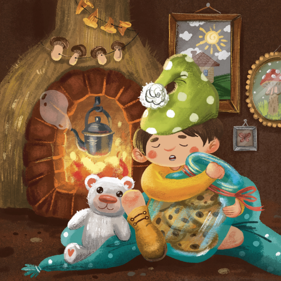 a cozy shelter under a large mushroom, where fairies are already waiting for him with fragrant