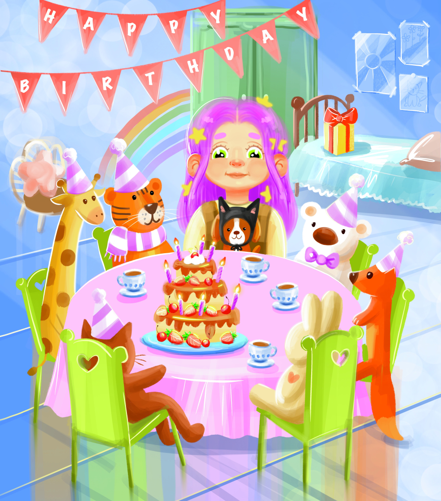 Сьогодні — день народження дівчинки, і вона запросила на вечірку всіх своїх улюблених гостей: пухнастого білого ведмедика, хитру руду лисичку, високого жирафа, грайливого кота, веселого зайця й сміливого тигра. Кожна іграшка терпляче чекає на початок свята, а кімната вже сповнена святкових стрічок, яскравих кульок і аромату солодощів.