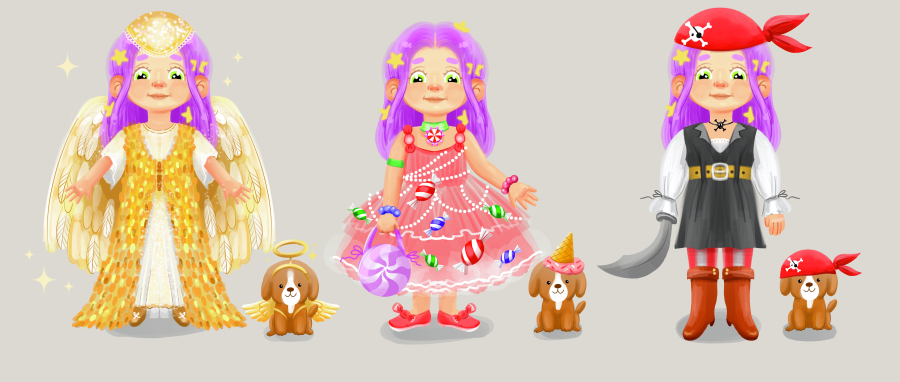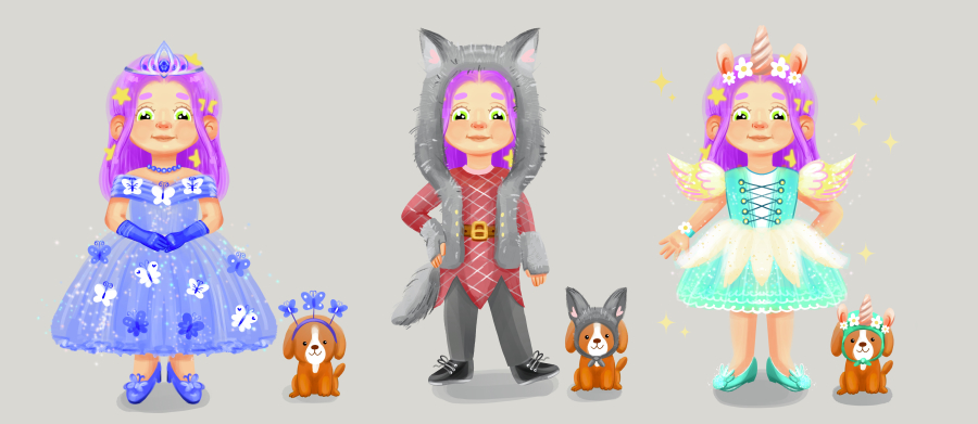 Та найважливіше — вирішити, у якому вбранні зустрічати гостей. Перед дівчинкою — ціла гора костюмів: веселий пірат із капелюхом і пов’язкою, ніжна принцеса зі срібною короною, сяючий ангел із прозорими крильцями, а ще чарівник, балерина, метелик і багато-багато інших образів, кожен із яких може зробити день особливим.