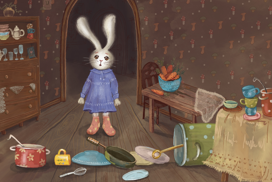 З цікавістю та трохи хвилювання він вирушає дослідити, хто ж порушив нічну тишу. Його шлях проходить вузьким коридором, повз напівпрочинені двері, аж доки він не зазирає на кухню… Там він бачить свою маму-кролицю: вона тихенько бере з підвіконня щойно спечений пиріг і повертається до своєї кімнати.