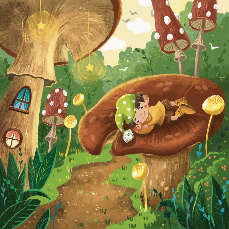 a cozy shelter under a large mushroom, where fairies are already waiting for him with fragrant