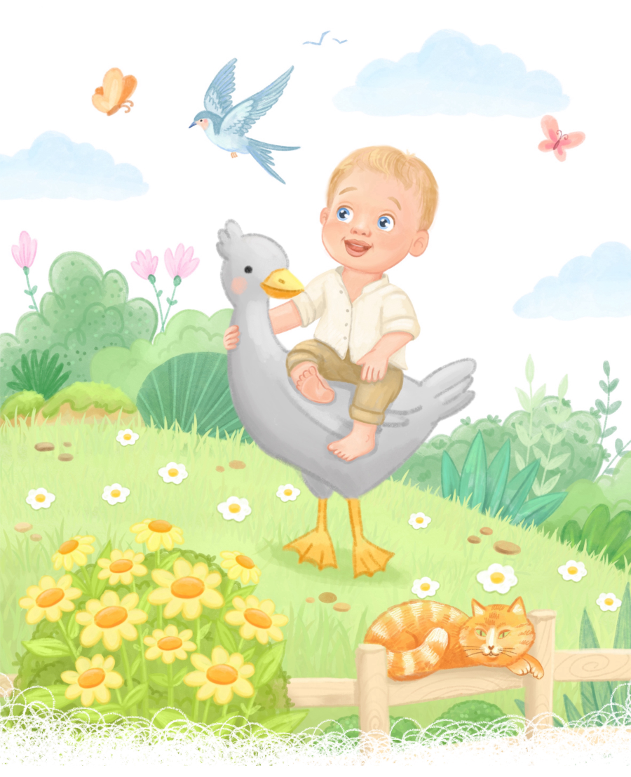 Моя мета полягала в тому, щоб через ілюстрації передати легкість, безтурботність і щирість дитячого світу. М’які акварельні відтінки, плавні лінії та легка фактура допомагають створити атмосферу невимушеності, у якій оживають маленькі пригоди героїв — сміх, гра, допитливість і тепло родини.