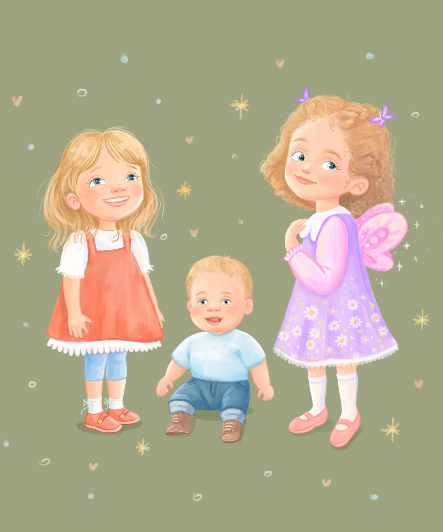 Цей проєкт — серія акварельних ілюстрацій до віршованої книги “Про Марійку та Софійку та їх брата Стефанчика”. Книга створена авторкою як тепла збірка історій про її онуків, сповнена любові, сімейного затишку та радості повсякденного дитинства.